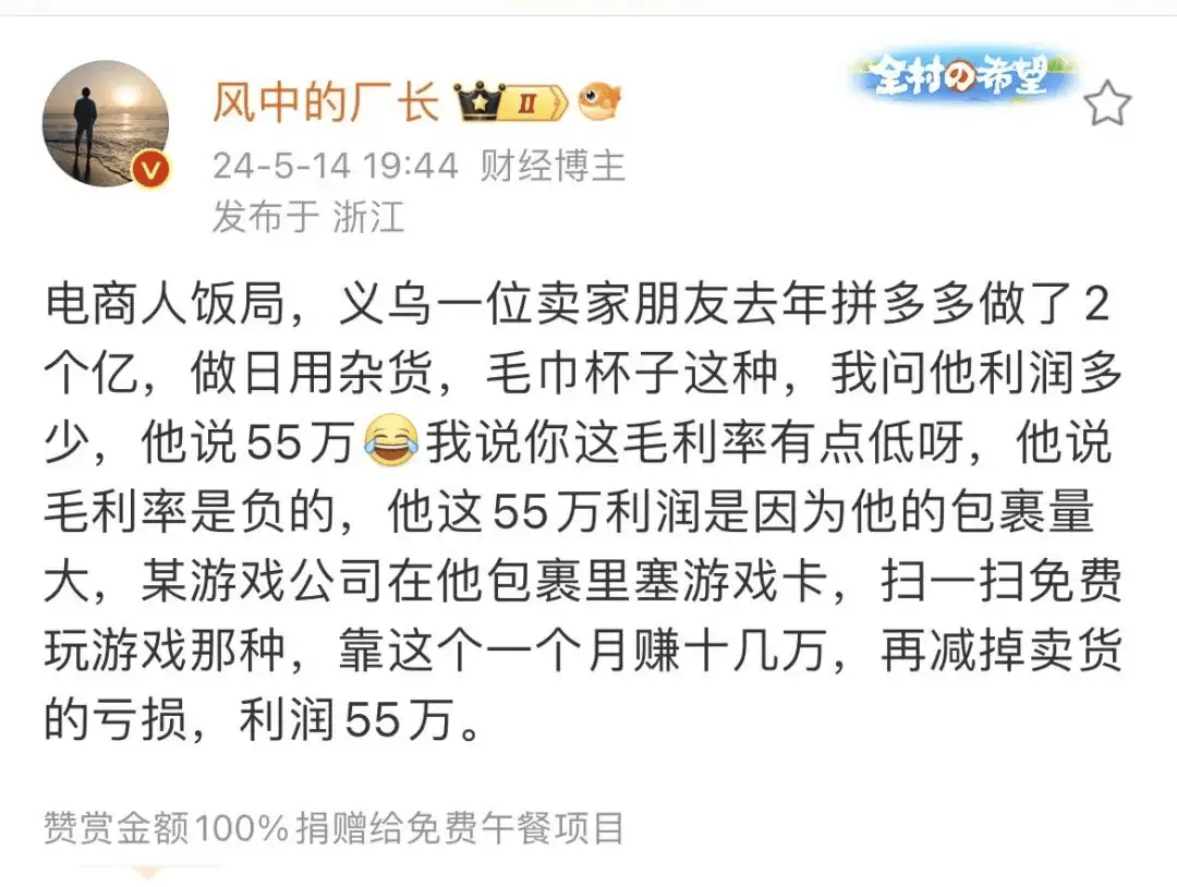 有博主説一位義烏的拼多多賣家一年做了2億流水,利潤55萬。但就是這55萬,也靠的是在包裹裏塞遊戲卡賺的遊戲公司的廣告費,這部分錢扣掉虧損後,才到手55萬。完全本末倒置了。