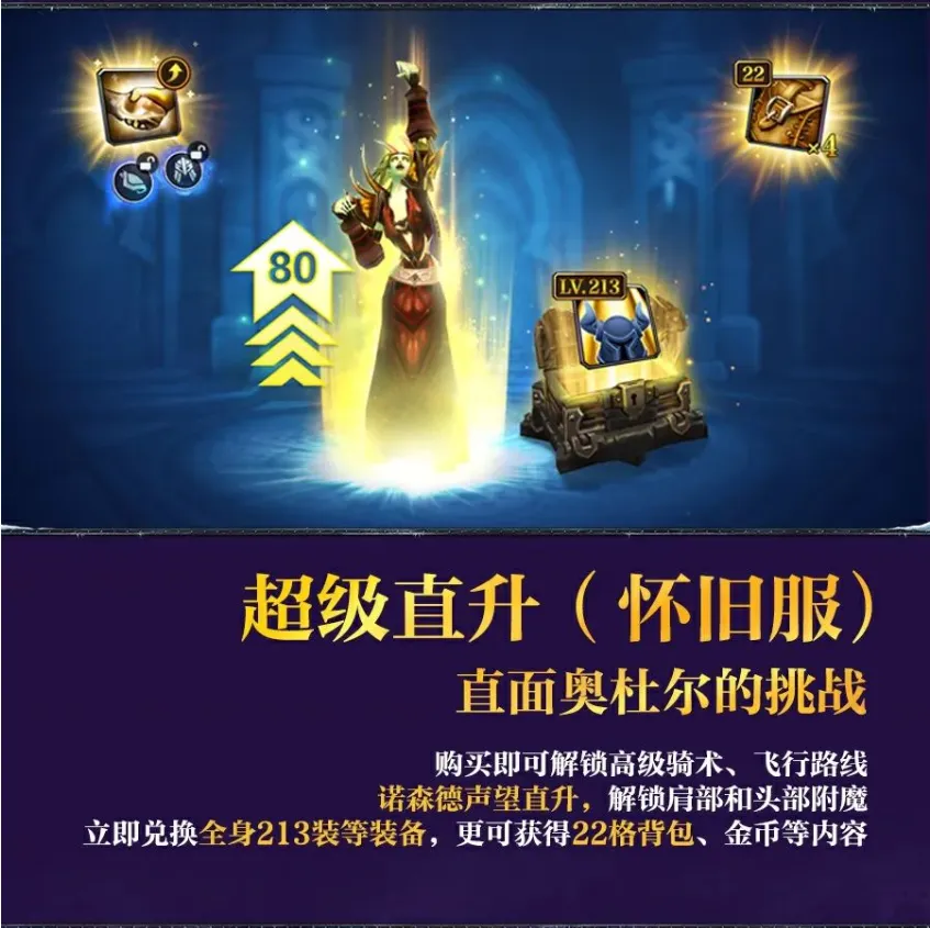 而且,國服“巫妖王之怒”懷舊服還迎來了特殊的直升補償政策,這對想要備戰“奧杜爾”的玩家來説,無疑是個好消息。在7月11日開啓後的國服戰網商城裏,“巫妖王之怒”懷舊服角色直升服務從原本的70級調整到了80級,並附帶“巫妖王之怒”團隊副本“納克薩瑪斯”的畢業裝備,如果你對裝等的要求沒有那麼高,那麼這一套下來也基本已經滿足了參與奧杜爾團本的條件。