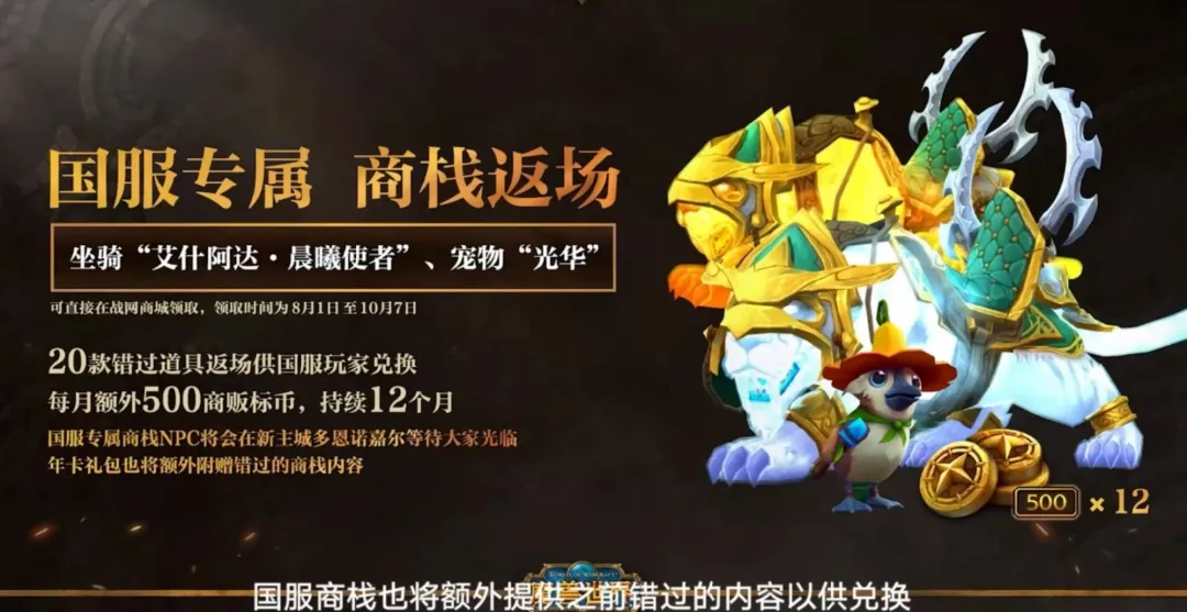 而對其他已經結束的“商棧”活動內容,網易則決定以每月直接給玩家提供額外500“商棧幣”的形式進行追趕,並在主城內加入了一個國服特有的返場NPC,用來供玩家換取往期國服錯過的“商棧”物品。