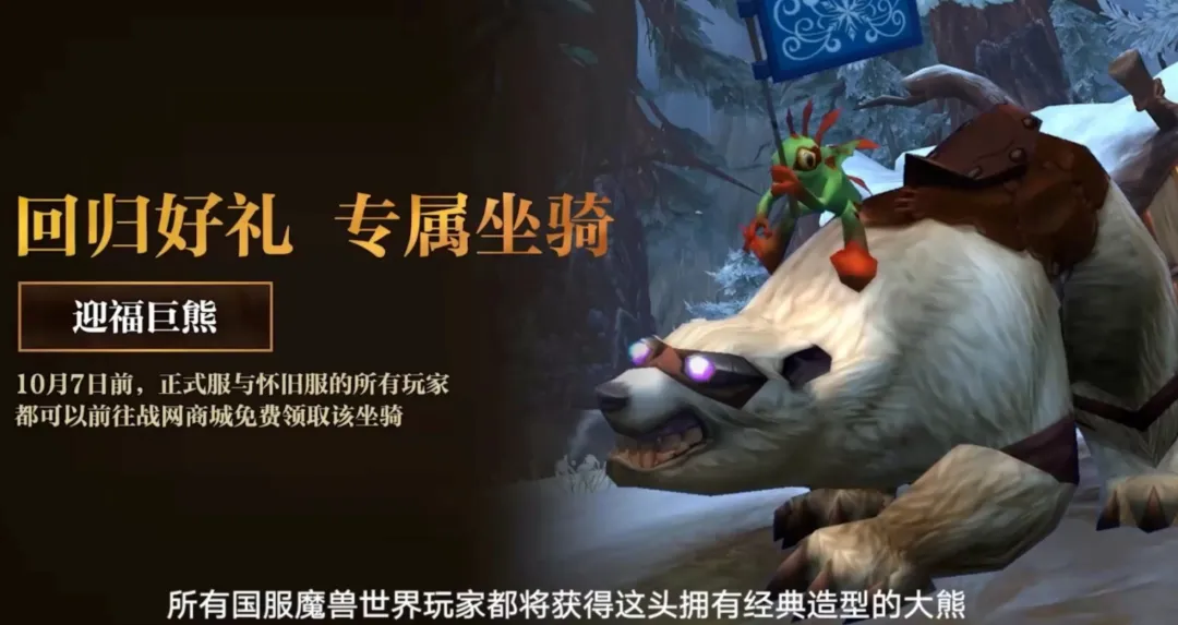 《魔獸世界》的老玩家都知道,暴雪對這些遊戲內容的改動一向卡得很死。“迎福巨熊”作為已經絕版的“暴雪巨熊”的同模型坐騎,這次能夠在迴歸活動中免費獲取,確實讓我感受到了網易和暴雪對於迴歸玩家的誠意