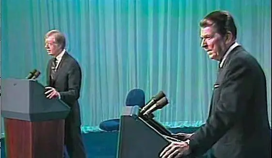 為啥美國媒體如此看重這場辯論?因為這將決定美國的命運。大家應該都知道,美國曾經在1960年代末到1970年代內外交困,內政經濟不行,外交地緣上遭到重大打壓不斷後退,所以1980年的總統辯論關係到美國接下來的國家走向。1980年的總統選舉是在時任總統吉米·卡特和共和黨候選人,前加利福尼亞州州長羅納德·里根之間的競爭,最終卡特因伊朗人質危機加上國內經濟狀況惡化而兵敗如山倒,僅贏得了6個州和首都哥倫比亞特區共49張選舉人票,而里根則贏得了另外44個州,共489張選舉人票,創下以未現任總統身份參選而獲得選舉人票數目的最高紀錄。