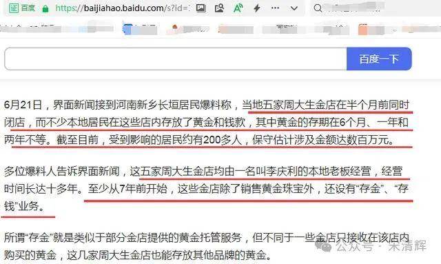近日,有媒體報道,有居民爆料稱,位於河南新鄉長垣的五家周大生珠寶店在半個月前突然同時閉店,而不少當地居民在該店內存放了黃金和錢款。並且,這五家周大生珠寶店均由一名叫李慶利的本地老闆經營,經營時間長達十多年。至少從7年前開始,這些金店除了銷售黃金珠寶外,還設有“存金”、“存錢”業務。截至目前,受影響的人數約為200多多人,涉及金額則達數百萬元。