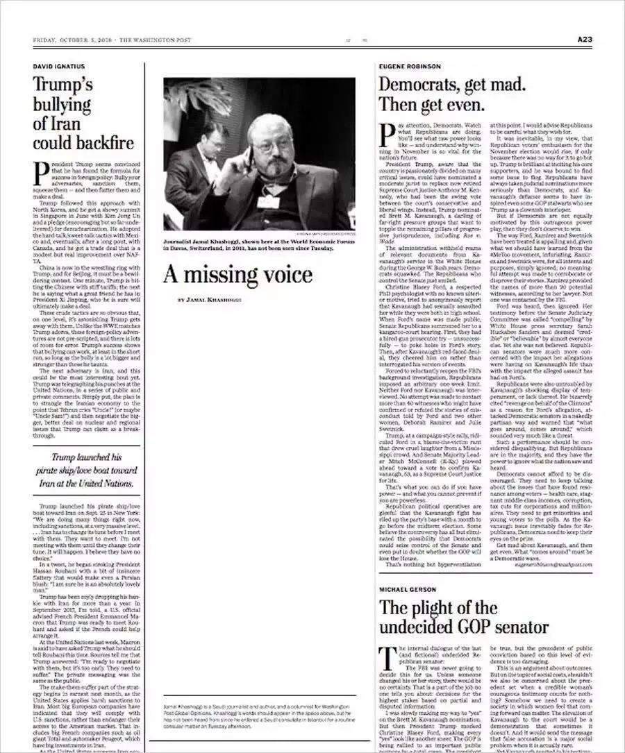 華盛頓郵報為首,發佈重要文章-消失的聲音,説美國的價值觀是怎麼了?我們居然和壓制自由聲音的兇手合作,特朗普居然和薩勒曼狼狽為奸,這美國還能好得了嗎?