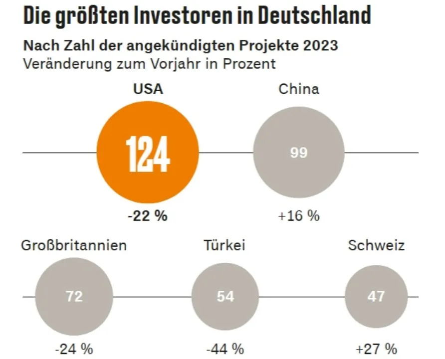 |從2023年對德投資項目最多的國家來看,中國雖仍排在美國之後位列第二位,但增長16%,相比之下美國對德投資下降了24%,來源:安永。
