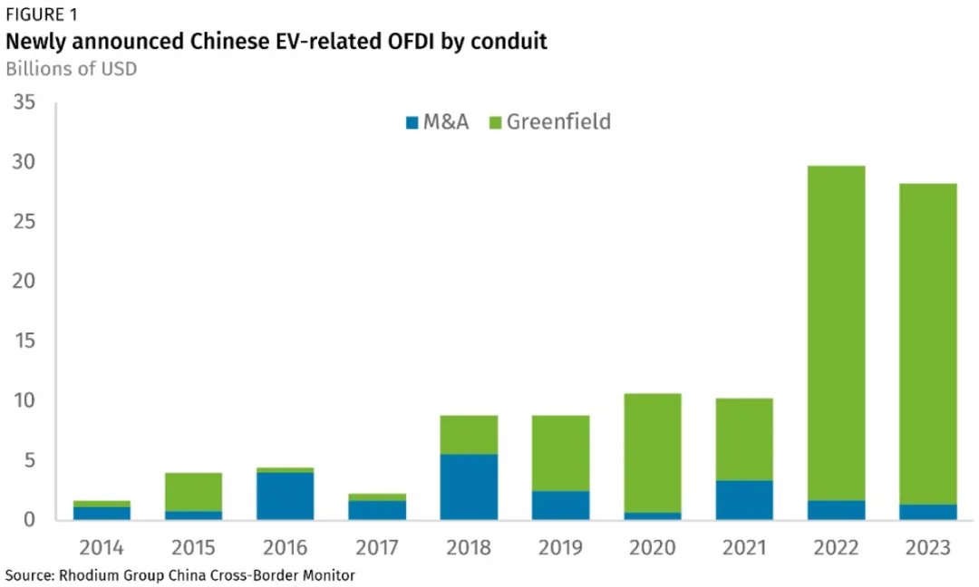 榮鼎公司最新報告指出,2023年中國對全球電池與電動汽車行業投資達到歷史新高,儘管乍一看當年282億美元尚未趕上2022年的297億美元,但其實這一數字是保守估計,還未包括幾個投資額不明確的大項目,例如比亞迪的匈牙利工廠。