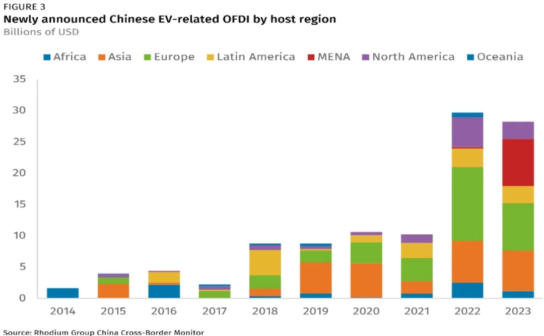 強勢的產業與技術,支撐着中國企業對全球進行更強有力的擴張。近年來,隨着美國市場對華關閉,中國電動汽車四分之三對外直接投資從北美轉向歐洲、中東和亞洲,同時往往積極參與亞非拉礦山投資、原材料生產,已經逐步建立起了自己在電動車行業的護城河。