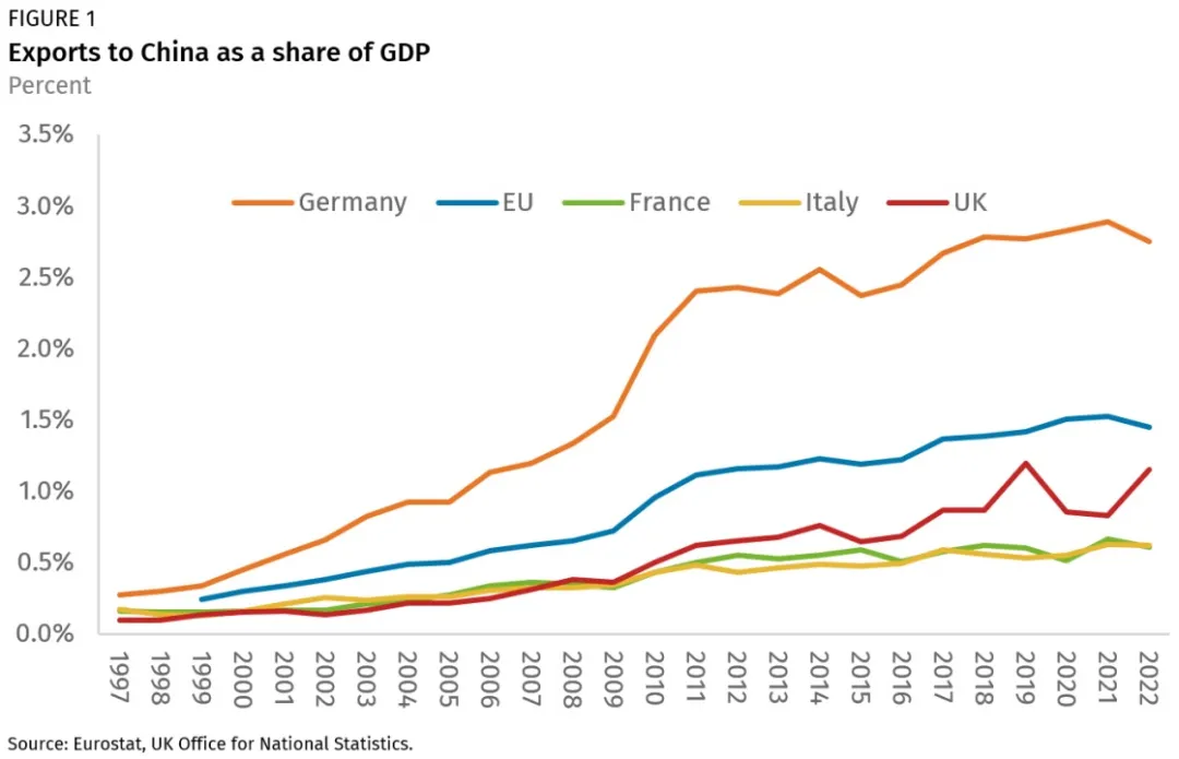 |歐洲各國對華出口佔其GDP比重,可以看出,來源:歐洲統計局、英國國家統計局等。