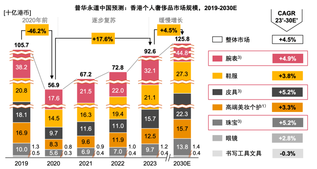 普華永道今年4月發佈的《中國內地及香港地區奢侈品市場報告》亦強調,香港個人奢侈品市場受消費激勵措施等正向政策推動緩慢復甦,預計將以4.5%的年均複合增速增至2030年1258億港元規模,增長最多的三大類奢侈飾品為皮革製品、珠寶及腕錶。