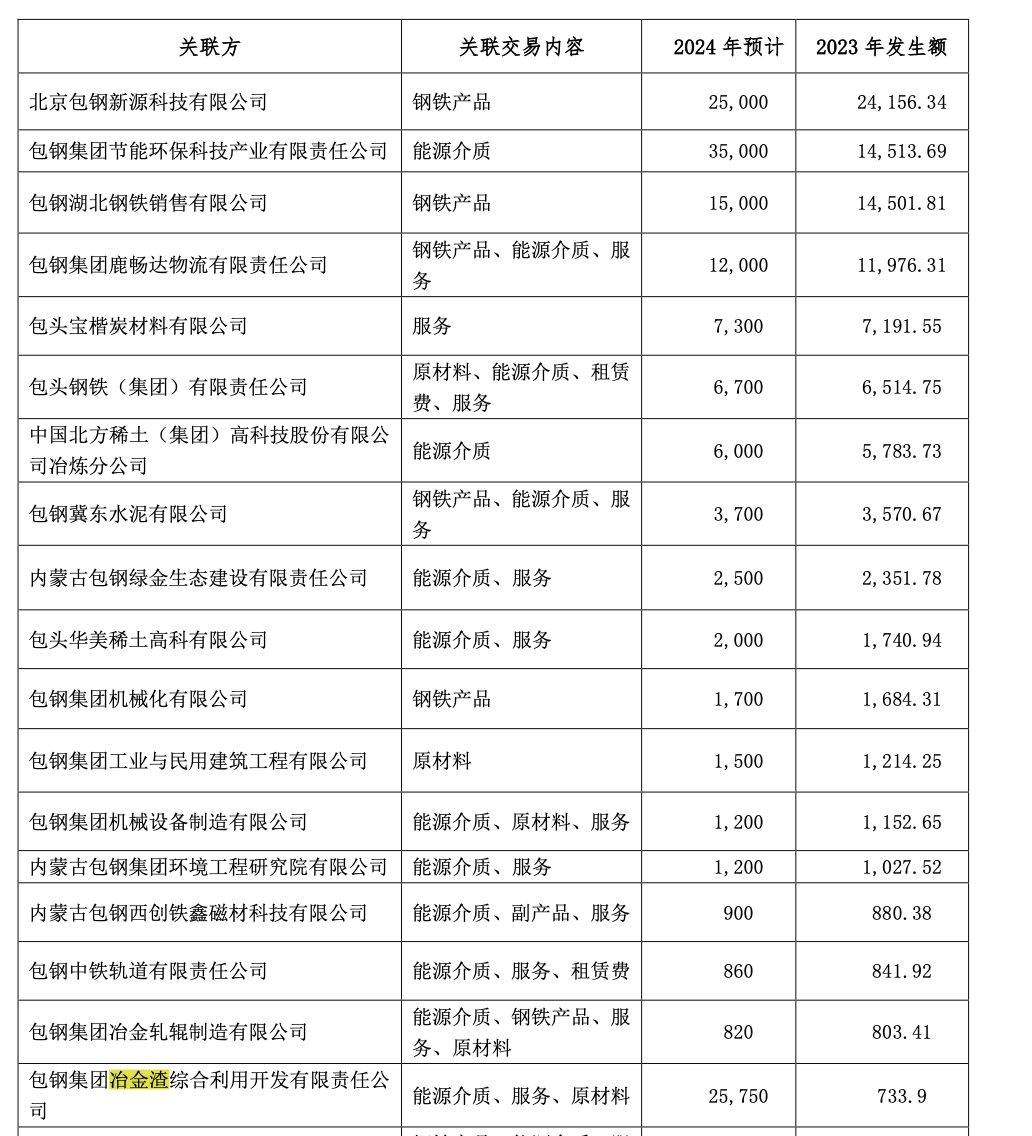 在上述關聯交易議案中,包鋼股份與北方稀土(600111.SH)的稀土精礦關聯交易額約為106億元。另外,包鋼股份與包鋼集團冶金渣綜合利用開發有限責任公司(下稱“冶金渣公司)的2024年關聯銷售預計金額暴漲至2.58億元,也受到外界關注。