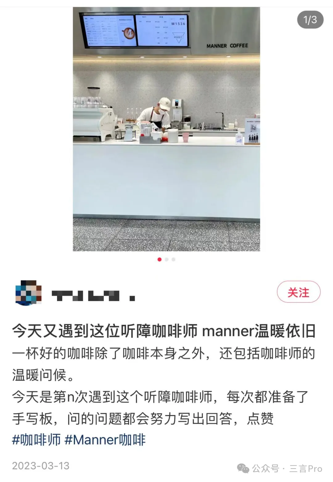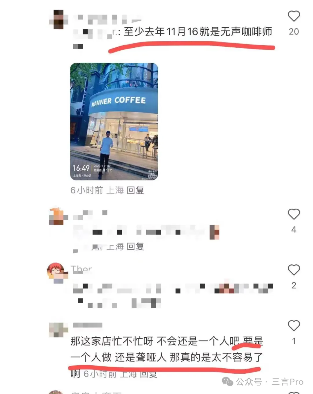 三言諮詢了今天發帖説Manner換聾啞人的網友,對方表示,店裏只有一個咖啡師。