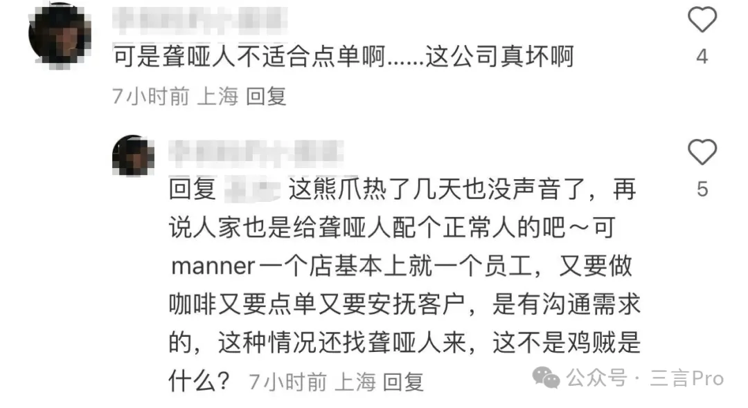 也有網友指出,聾啞人不適合點單,Manner一個店基本上就一個員工,又要做咖啡又要點單又要安撫客户,是有溝通需求的,這種情況還找聾啞人來,不合適。