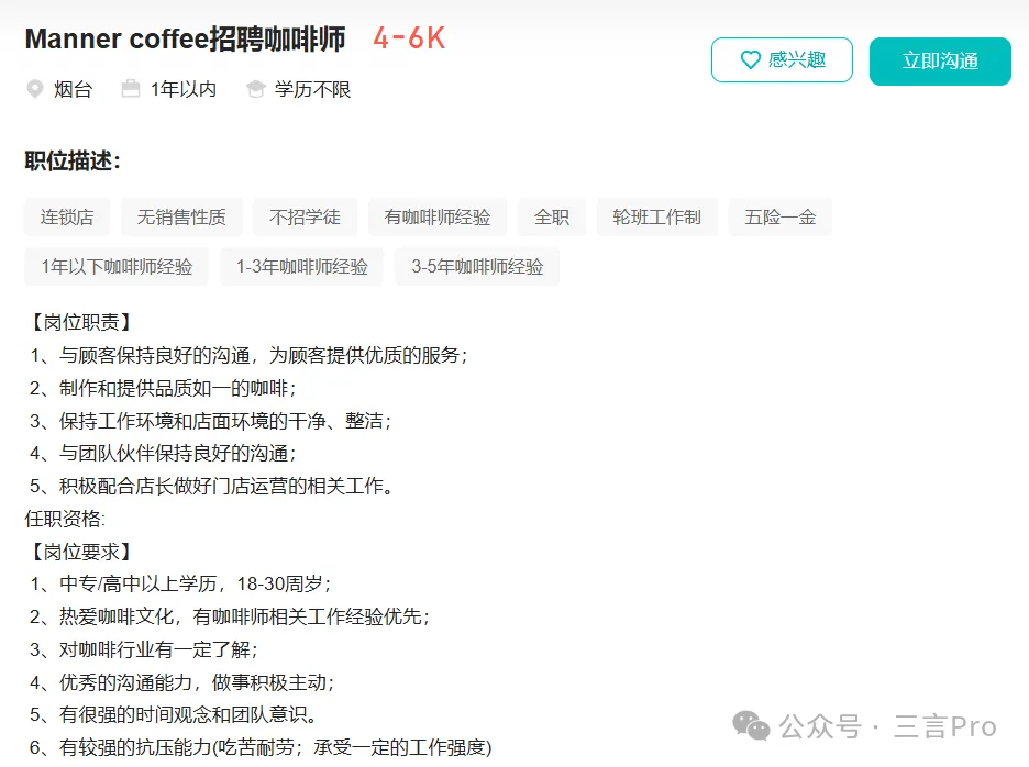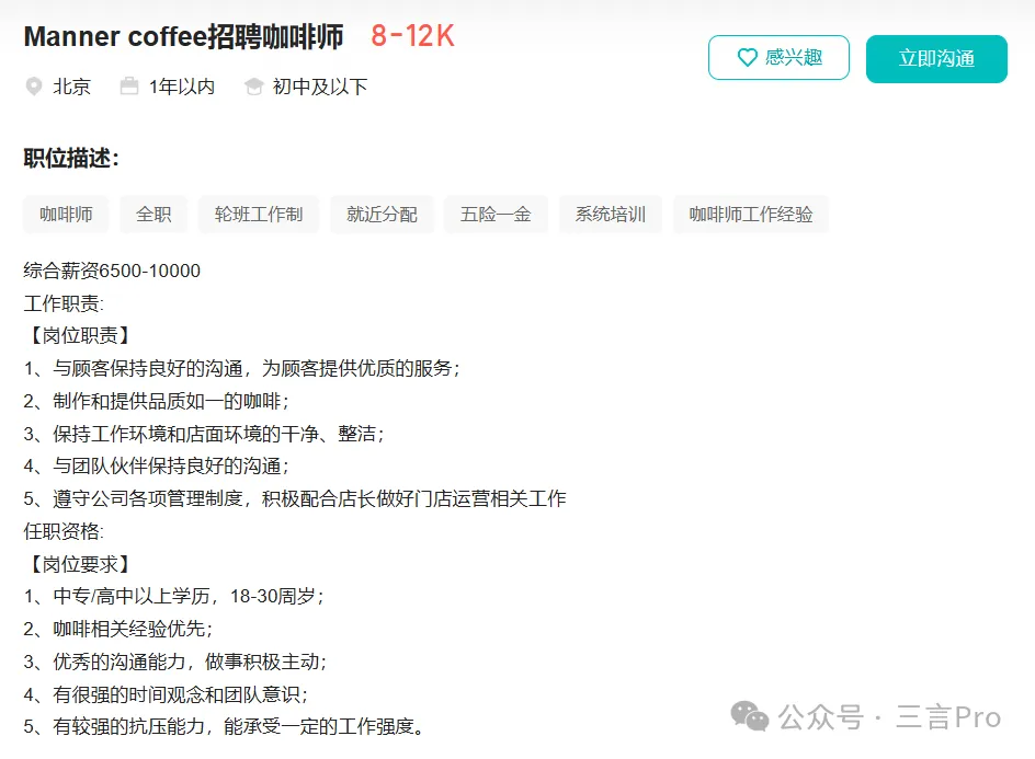 BOSS直聘上,Manner咖啡招聘的咖啡師,不同的店薪酬不同,4000-10000+都有,崗位要求基本一樣。
