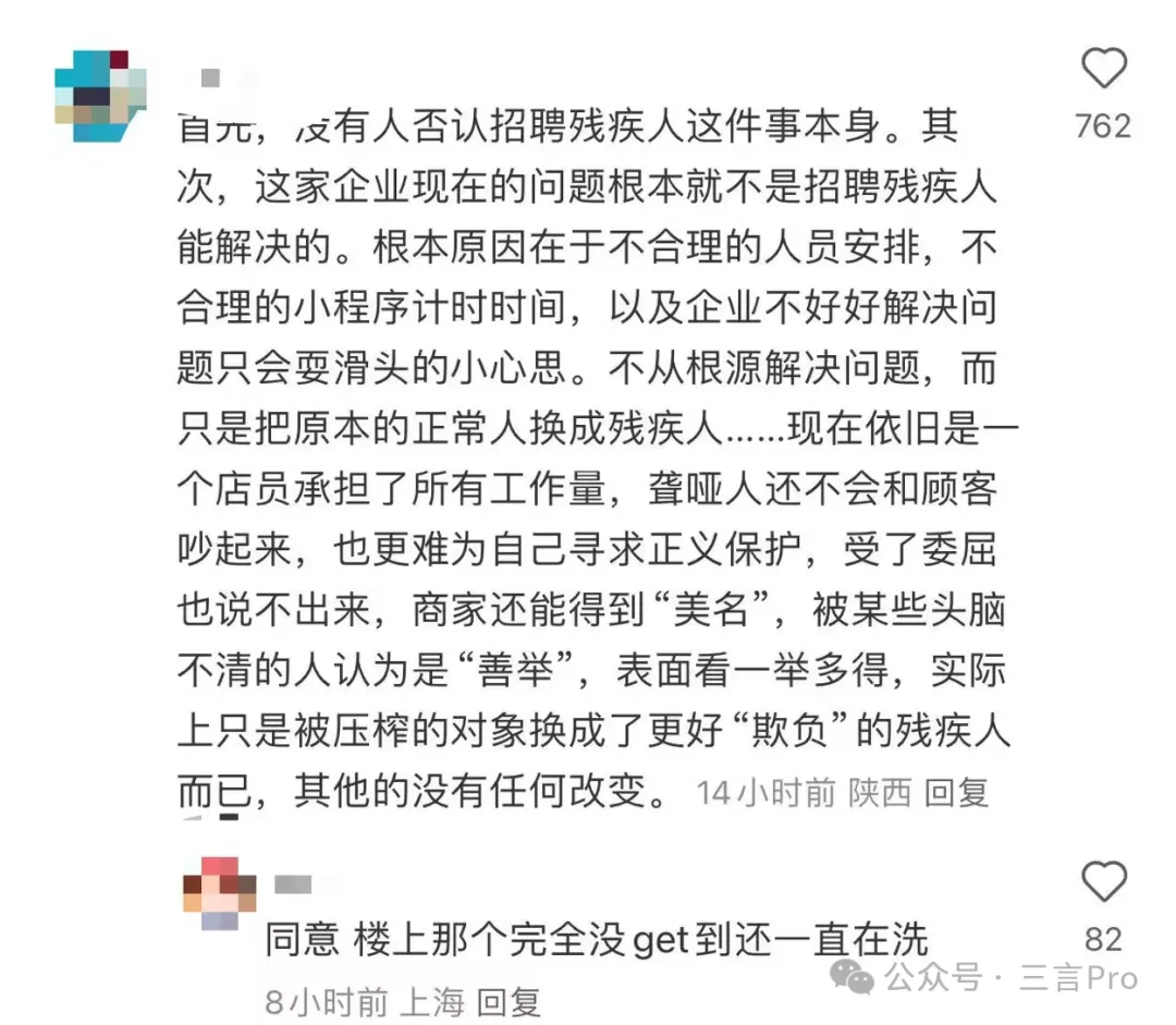 還有網友表示,沒有人否認招聘殘疾人這件事本身。但現在依舊是一個店員承擔了所有工作量,聾啞人還不會和顧客吵起來,也更難為自己尋求正義保護,受了委屈也説不出來,商家還能得到“美名”,被某些人認為是“善舉”,表面看一舉多得,實際上只是被壓榨的對象換成了更好“欺負”的殘疾人而已,其他的沒有任何改變。