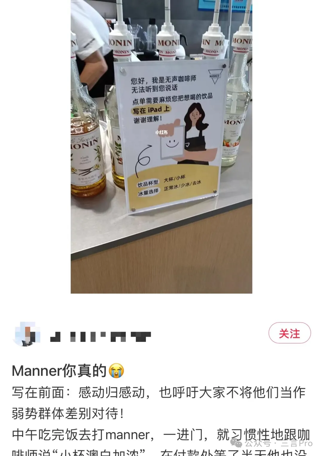 有網友稱,自己去Manner,一進門就習慣性地跟咖啡師説“小杯澳白加濃”,在付款處等了半天他也過來點單。後來才發現有提示牌提示,咖啡師是聾啞人。