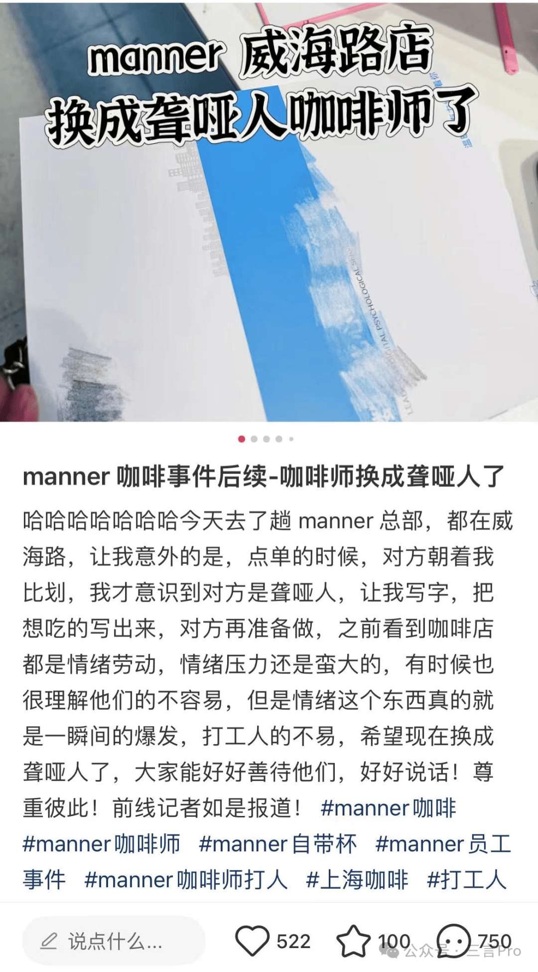 目前,説“Manner威海路店換成聾啞人咖啡師了”的帖子已不可見。
