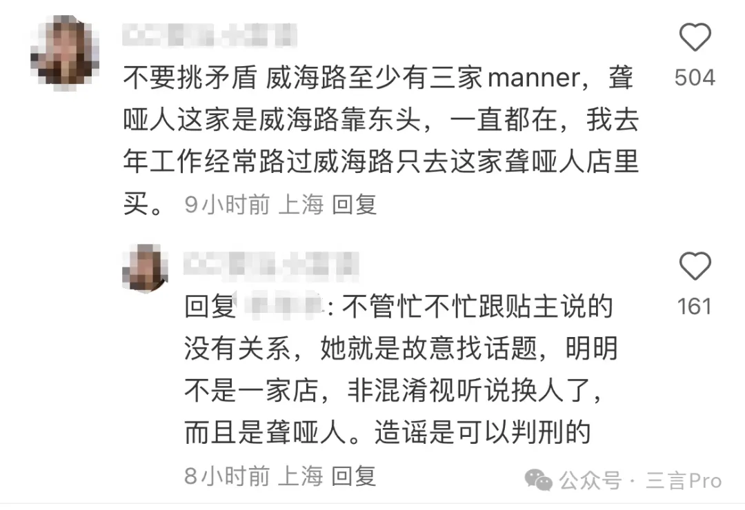 不過,很快有網友在評論區表示,威海路至少有三家Manner,聾啞人這家是威海路靠東頭,一直都在,她去年工作經常路過威海路只去這家聾啞人店裏買。
