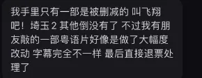 比如在《飛翔吧!埼玉2》裏,電影雖沒有大幅度刪減,但也出現了“基本上都是一段裏突然少了幾句話,片子前半段比較多,後半段就只少了兩句話”,對此,小南心裏也感覺到委屈——