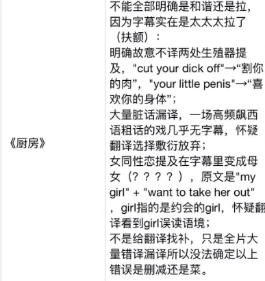在一則關於上影節的刪減片段統計的表裏,有影迷記錄了這部電影的翻譯與字幕的不少問題。
