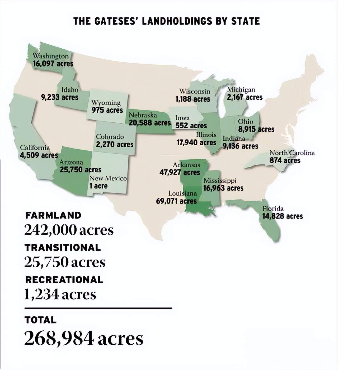 截至2021年,蓋茨在全美18個州擁有優質農田,總計約26.9萬英畝,跟香港的土地面積相當。