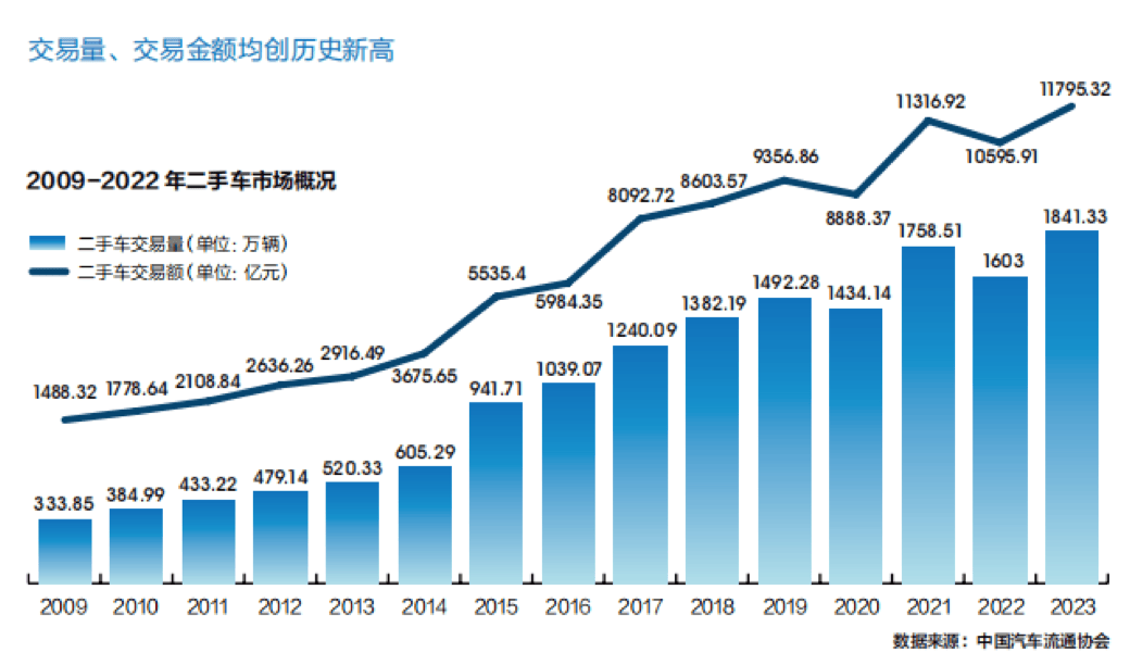 中國汽車流通協會披露的數據顯示,2023年,中國二手車累計交易量1841.33萬輛,同比增長14.88%,累計交易金額為11795.32億元。