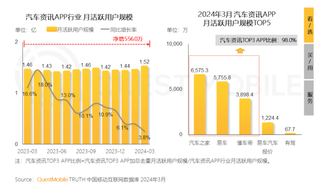 這主要是因為移動互聯網流量紅利觸頂,汽車媒體平台的月活規模很難再高速增長,廣告業務觸及瓶頸。QuestMobile數據顯示,截至2024年3月,汽車資訊App行業用户規模為1.52億,過去一年的同比增長率持續下滑,目前僅為個位數。