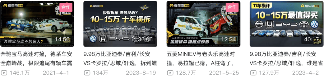 B站平台中,懂車帝的奔馳寶馬高速對撞、10~15萬級十車拆解、五菱MINIEV與老頭樂高速對撞等節目均擁有超百萬的播放量。這些節目不光可以提高懂車帝的行業知名度,並且可以將觀眾引流至懂車帝App中。