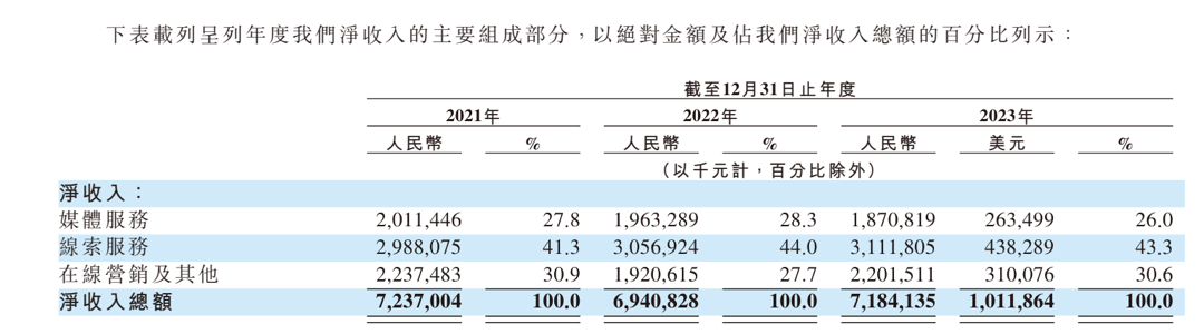 以汽車之家為例,其2023年營收71.84億元,同比增長3.5%;歸母淨利潤18.8億元,同比增長4.04%。其中媒體服務營收18.71億元,營收佔比26.0%;線索服務營收31.12億元,營收佔比43.3%,此二者合計貢獻近七成營收。