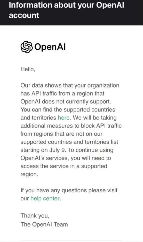 北京時間6月25日凌晨,有開發者收到了OpenAI的郵件,郵件寫道:“數據顯示,您組織的APl流量來自OpenAl目前不支持的地區。”並表示:“從7月9日起,我們將採取額外措施,阻止來自不在我們支持的國家和地區列表中的地區的APl流量。”