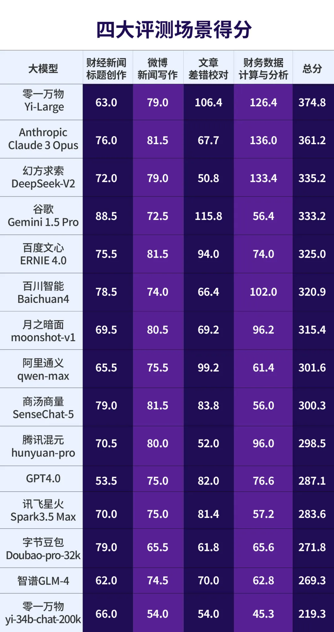 零一萬物Yi-Large成為最大“黑馬”,在“財經新聞標題創作”“微博新聞寫作”“文章差錯校對”“財務數據計算與分析”四大應用場景的總分排名第一。幻方求索DeepSeek-V2、百川智能Baichuan4則在“財務數據計算與分析”場景顯示出強大的數據計算和分析能力。而一直備受各界推崇的GPT 4.0在本次評測中表現不佳,甚至在“財經新聞標題創作”場景中排名墊底。