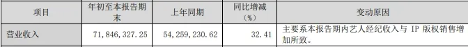 根據歡瑞2024年一季度財報數據,報告期內公司營業收入為7184.63萬,比去年同期增長了32.41%,在未有新劇播出的情況下依舊能實現增長,主要是受藝人經紀收入與 IP 版權銷售增加所致。
