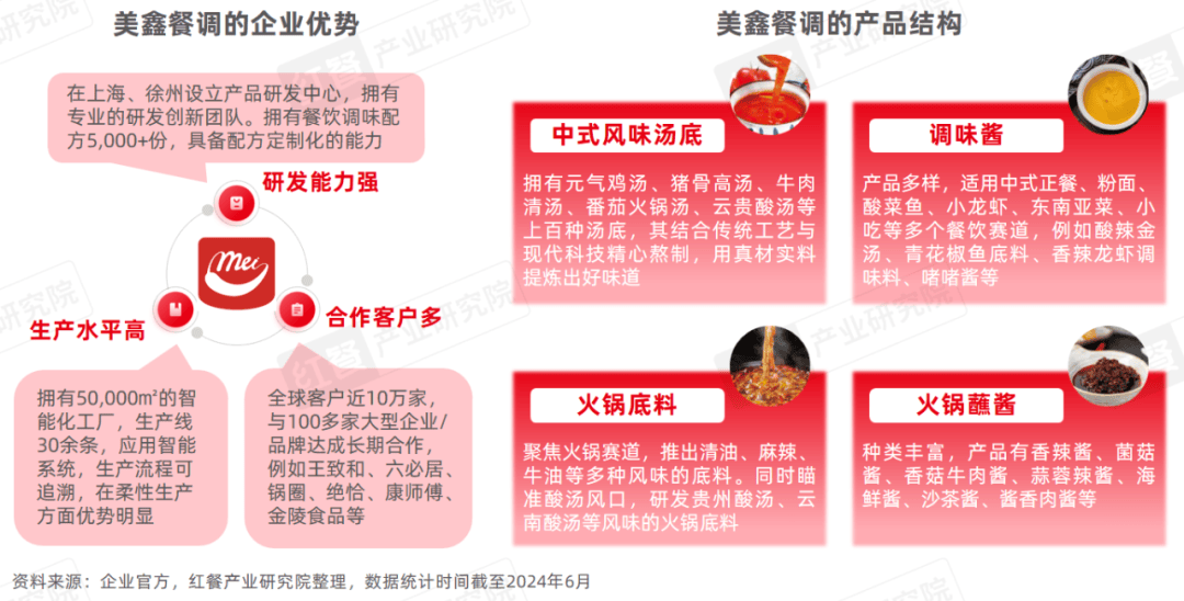 在目前的酸湯供應商中,不少企業發展亮眼。其中,美鑫餐調是國內複合調味料的重點企業,其在餐飲調味配方研發、智能工廠建設等方面具備獨特優勢。作為湯汁醬料的優質供應商,美鑫餐調與較多知名企業建立了合作關係,例如六必居、鍋圈等。