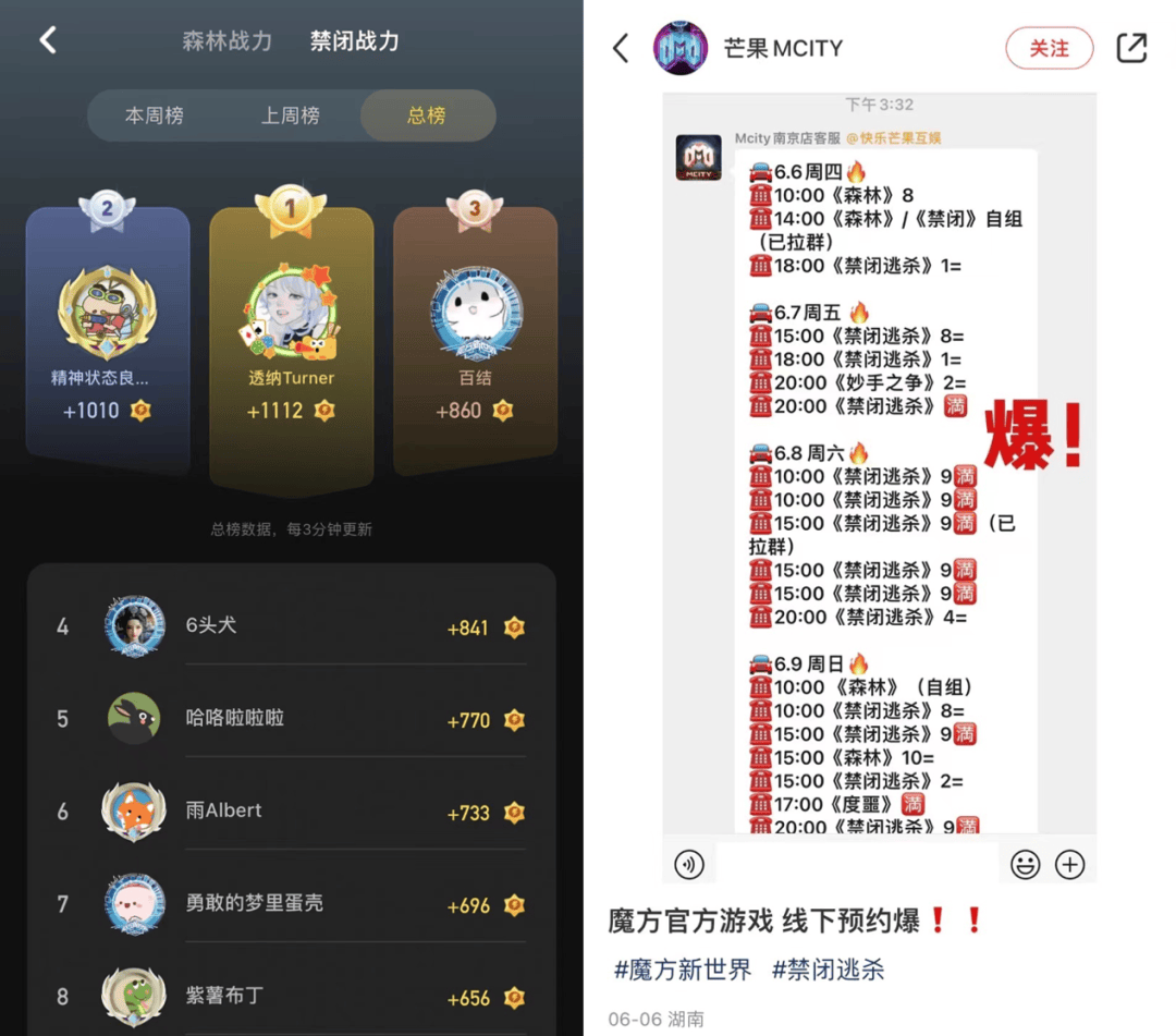 **線下同款主題遊戲同樣火爆。**目前芒果MCITY已經逐步上線了“禁閉逃殺”、“妙手之爭”等主題遊戲。在官方賬號釋出的線下預約記錄中,“禁閉逃殺”在節目上線後快速成為了許多線下迷綜愛好者的新偏愛,甚至於天崩開盤的風也吹到了線下,讓現場慘叫聲一片。