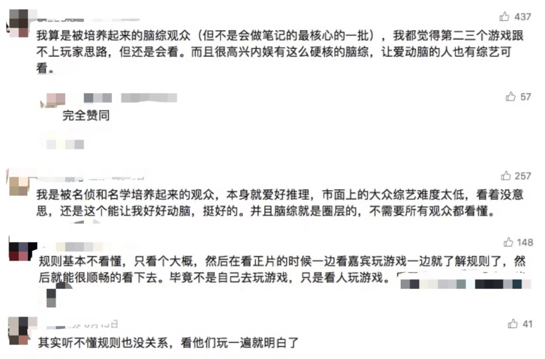 有趣的是,在微博、小紅書等社交平台下,我們發現和娛小獸一般坦承被“養成”的觀眾不在少數:他們或也曾困於規則,但最終熱情分享攻關攻略,“聽不懂規則也沒關係,看他們玩一遍就明白了”。甚至回過神來再度研讀規則、覆盤遊戲,也別有一番趣味。