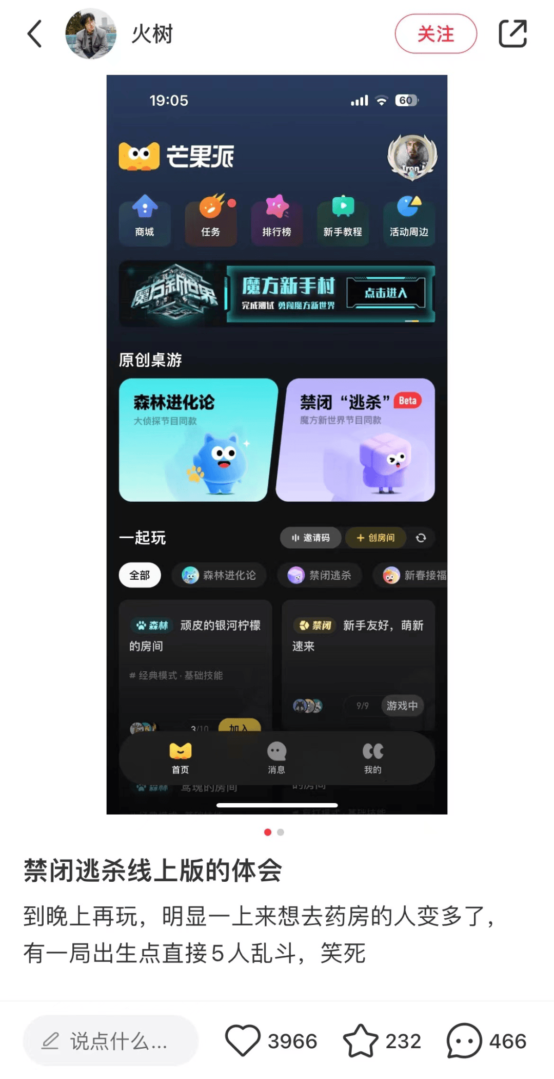 “禁閉逃殺”線上遊戲同樣火熱。玩家火樹曾在直播中透露,線上遊戲自己玩了二三十把,為了探索多種玩法他甚至還用多個手機同時玩三把;小紅書上他還發帖感慨“藥房”的火爆,“有一局出生點直接5人亂鬥”的局面也是心酸又好笑。看起來大家不僅熱衷於同款遊戲,還在快速吸取節目玩家的經驗教訓。