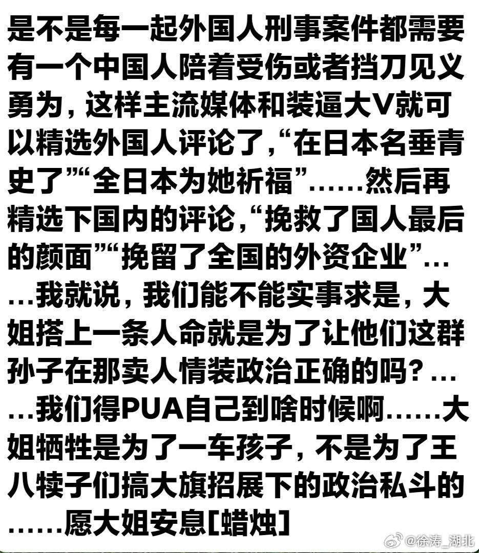 1.現在我們並沒有得到有關犯罪嫌疑人行兇的真實動機的可靠信息,只知道有一位中國女性為了保護現場的無辜者而獻出了生命。這些人現在就能肯定嫌疑人一定是因為極端仇Japan,是不是太急了點兒?難道是因為他們早就知道或者早就盼望着會有這麼一出?