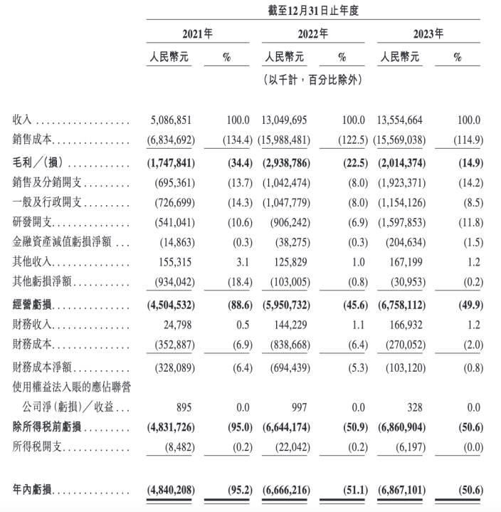 DoNews查詢招股書發現,2021-2023年,合眾汽車營收分別為50.87億元、130.5億元和135.55億元;收入增速放緩的同時虧損卻在加劇,同期分別虧損48.4億元、66.66億元和68.67億元,3年間合計虧損183.74億元。