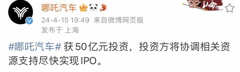 4月15日,哪吒汽車在其官方微博宣佈獲50億元投資,且投資方將協調相關資源支持儘快實現IPO。