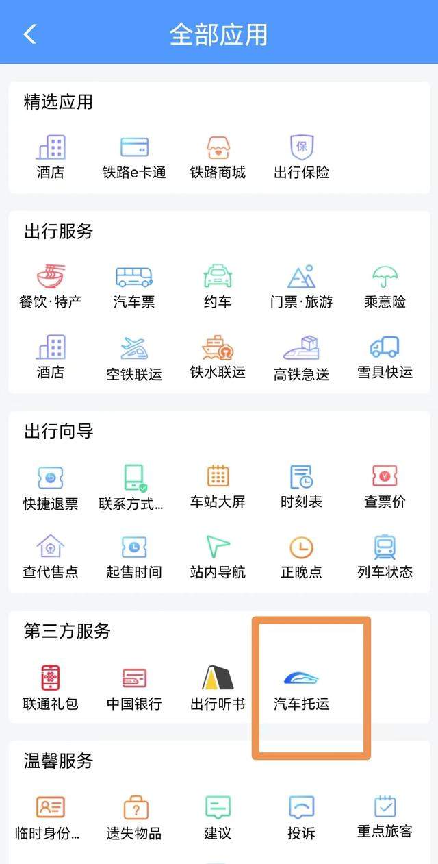 這項服務目前已在鐵路12306APP上線,旅客可以在APP的全部應用頁面,找到汽車託運選項,下單後, 就會有專人上門提車,並使用鐵路商品汽車專用運輸車將汽車安全送達目的地。