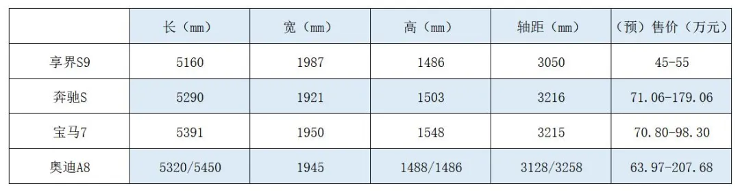 上表中不難看出,除了寬度,享界S9“遙遙領先”三大德系旗艦車型外,長、高和軸距也並沒有討到便宜。但看到最後一列,你就明白餘承東的底氣了。