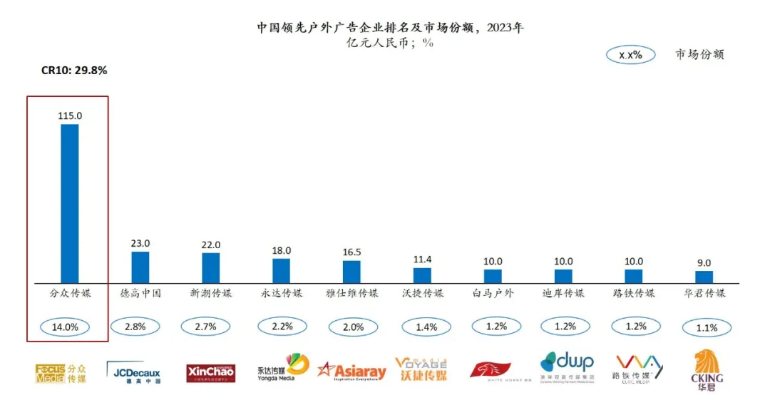 根據中國廣告協會的《2023年全球及中國户外廣告市場報告》,國內前三大户外媒體運營商分別是分眾、德高和新潮,他們佔到市場19.5%的市場份額。