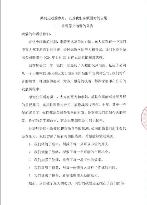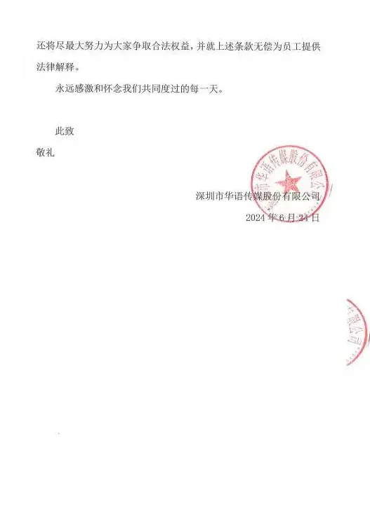 6月24日晚間,華語傳媒發佈公告,公司將於6月30日停止運營。