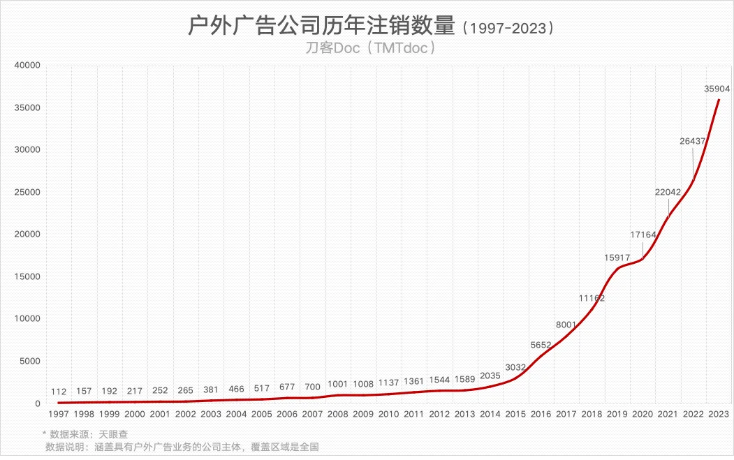 從1997年至今,27年間註銷的户外廣告公司共計18.3萬家。這些户外廣告機構既有路邊的製作廣告牌的小作坊,也有廣告設計的個人工作室,以及業務中涵蓋户外廣告的廣告傳媒公司。