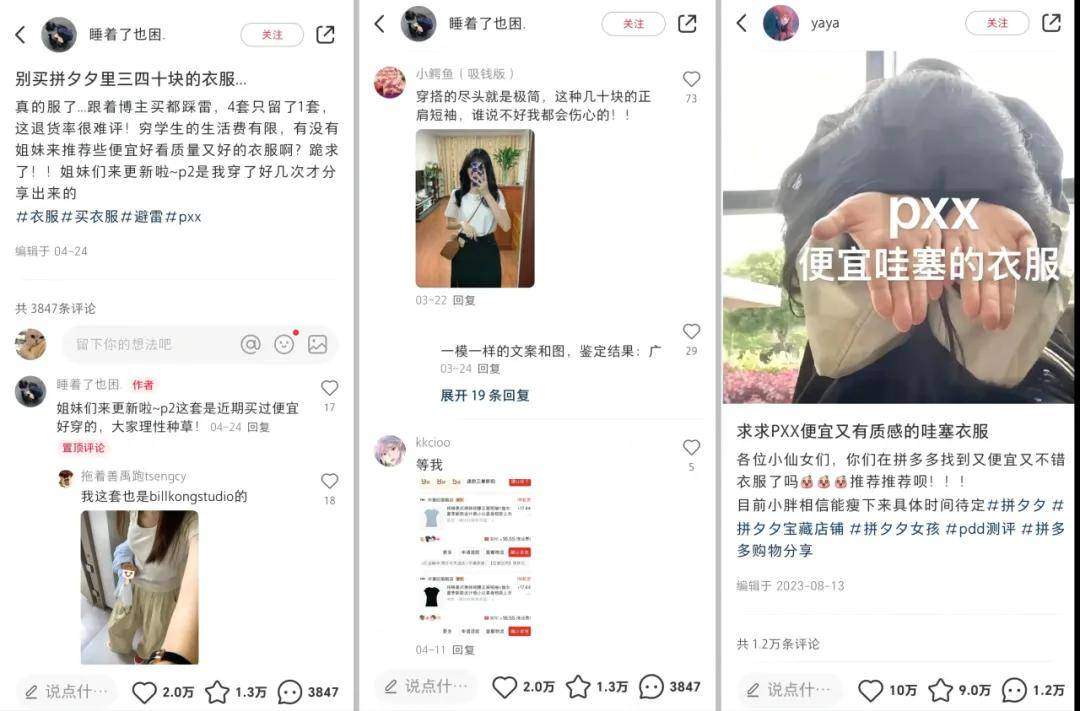 在小紅書上有一些類似這樣的帖子:“避雷!拼多多沒有好看的衣服”“你們真的覺得PXX的衣服好嗎”“你們不覺得pxx的衣服很次嗎?”