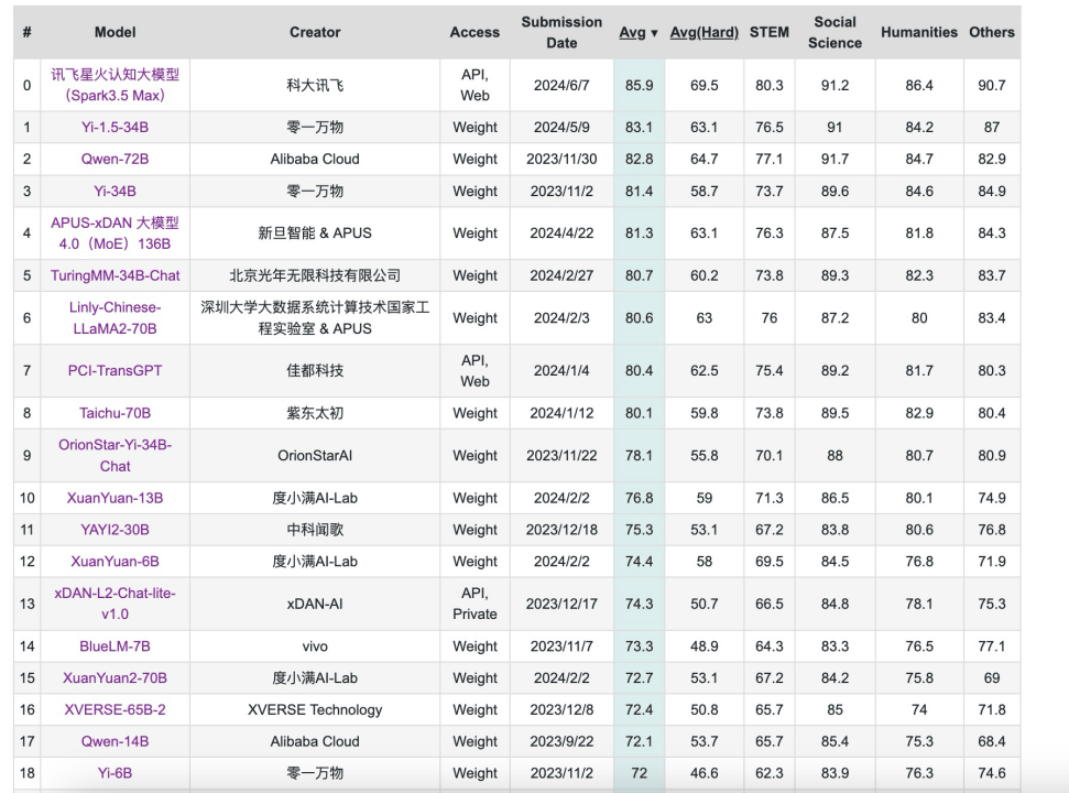 截至2024年6月28日,C-Eval榜單上,前20名全是我國的大模型,GPT-4位於21位。