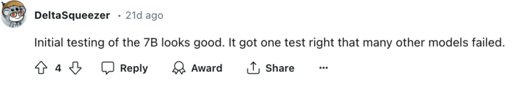 開發者們下下來一跑,發現竟然性能並不比 130 億參數的 Llama 2 弱多少,而且微調一下,用一張顯卡上就能跑。