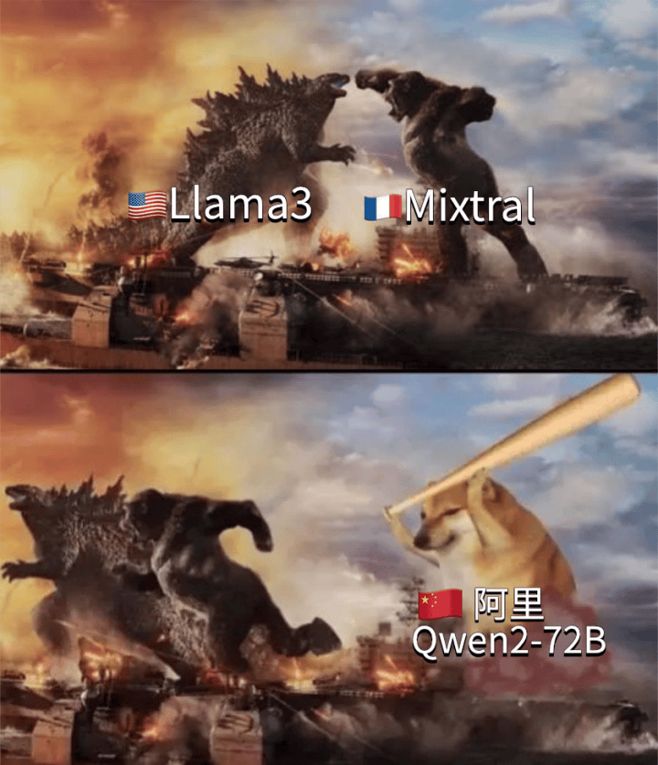 裏面有不少老熟人,當紅炸子雞,“法國的OpenAI”Mistral、“史上最強開源大模型”Llama3以及打敗了Llama3的通義千問Qwen2-72B(720億參數)。