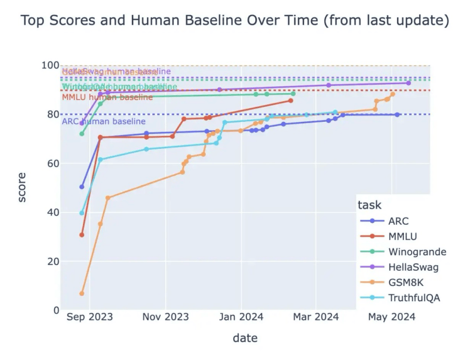 這是著名的開源社區Huggingface發佈的榜單Open LLM Leaderboard的最高成績。可以看到,從2023年9月到2024年5月,大模型在各個科目取得的成績都不斷地提高,都接近虛線,也就是人類水平。