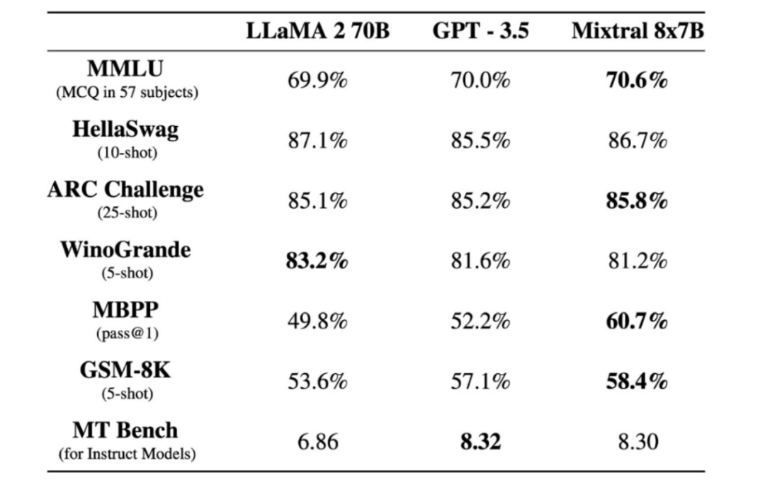 後來他們又推出了更大參數量的 Mixtral 8x7B,性能追平了Llama2和ChatGPT3.5。