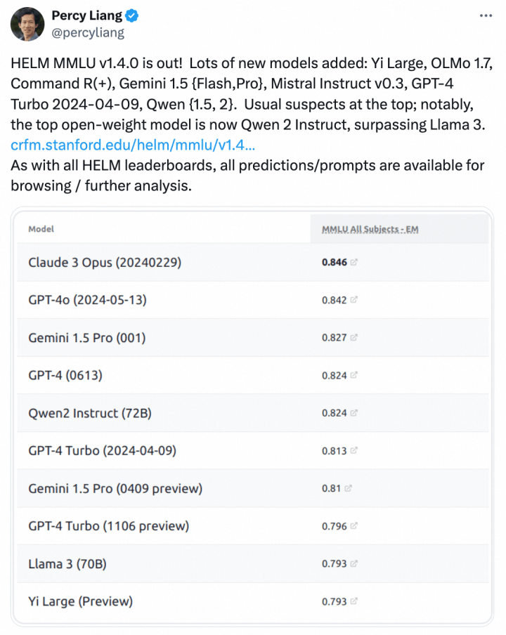 我又去看了看推特,開發者們測試後也都非常認可Qwen2的能力,比如這位斯坦福的計算機副教授Percy Liang: