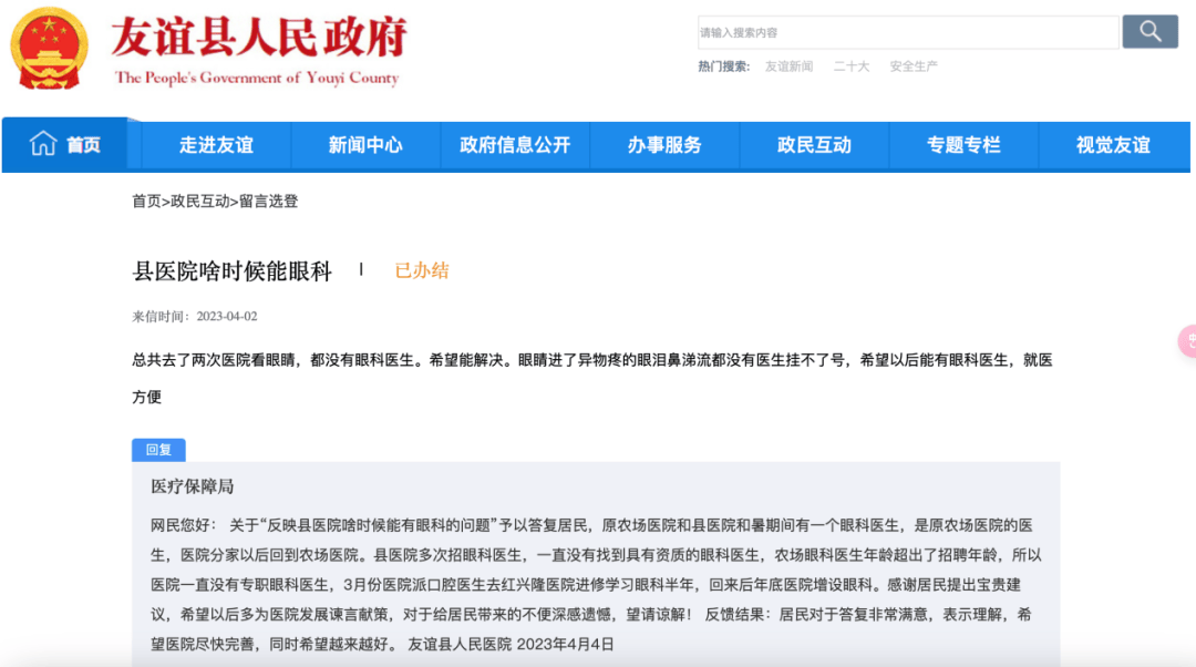 比如,2023年4月,一位友誼縣居民留言稱,自己總共去了兩次縣醫院看眼睛,都沒有眼科醫生,“眼睛進了異物,疼得眼淚鼻涕流都沒有醫生,掛不了號,希望以後能有眼科醫生。”